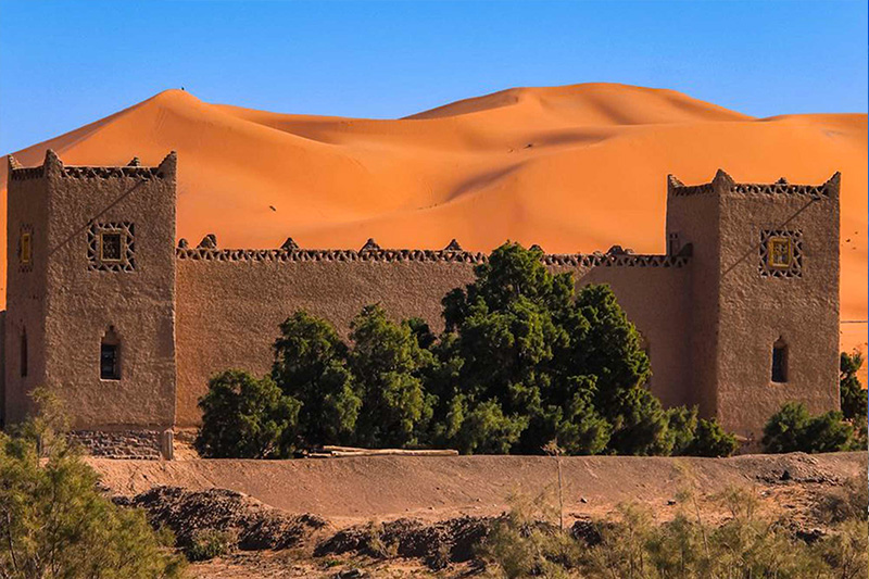 After breakfast in your Riad, you will go south-east along the caravan route to Merzouga. During this trip you will experience a glimpse of the Middle Atlas and the upper Atlas mountains. Stop at the cedar forest, the largest in Morocco, the Middle Atlas mountains, where you can see the wild untamed monkeys. after lunch in Midelt, you will continue through the large coming desert , and notice how the scenery changes to reveal hints of the desert as you approach the city Errachidia. Your journey continues along the luxuriant Ziz Valley and the palm trees and oasis of Tafilalet, famous for the cultivation of dates. This area is the foundation of the Alawite dynasty – the current royal family in Morocco. You will arrive in Merzouga in the end of the afternoon, Here you will bewelcomed with a cup of tea with mint before Choosing to spend the night either in the Riad or in the Berber tent. Half board (HB).